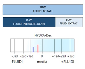 – Indice bioelettricio vettoriale HYDRA-Dex™: quantifica lo stato funzionale dell’idratazione. Un HYDRA-Dex superiore alla media con peso stabile o in lieve aumento può indicare un potenziale accumulo di fluidi corporei.