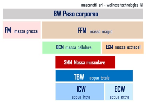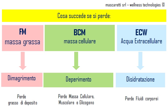 Queste due componenti possono talvolta avere un significato del tutto opposto se vengono rapportate allo stato fisico. A parità di FFM massa magra, un individuo potrebbe avere molti Fluidi Extracellulari ECW e una ridotta BCM Massa cellulare oppure una buona BCM ed una adeguata percentuale di Fluidi corporei con effetti sul metabolismo, sulla salute e su eventuali prestazioni atletiche completamente diversi.